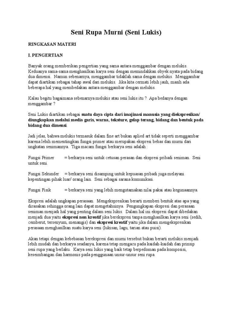 Pembahasan yang meliputi pengertian seni lukis menurut para ahli, teknik lukis, unsur, alat dan bahan lukis, aliran dan contoh dari seni lukis pengertian seni lukis menurut soni ade dan imam. Kanvas adalah sejenis kain yang tebal dan kuat. Seni lukis adalah salah satu cabang dari seni rupa, yang mengapresiasikan pengalaman artistik seorang seniman melalui bidang dua dimensi, sekaligus sebuah pengembangan yang lebih utuh dari menggambar. Melukis adalah kegiatan membentuk gambar dengan menggunakan pulpen kemampuan penggarapan serta penguasaan bahan dan alat merupakan aspek yang utama dalam melukis. Hubungan antara manusia dengan dirinya. Seni lukis termasuk dari bagian seni rupa dengan pengertian yang lebih sama. Dengan dasar pengertian yang sama, seni lukis dapat mengembangkan kemampuan menggambar seseorang menjadi lebih utuh dalam melihat objek tiga dimensi menjadi dua dimensi. Namun, sebenarnya lukisan bisa dibuat di berbagai medium, baik itu kertas, papan, dan bahkan. Menentukan media berkarya (alat dan bahan) media, alat dan bahan yang dapat digunakan dalam melukis adalah Terdapat beberapa alat dan bahan yang digunakan dalam berkarya seni lukis, yang terbagi dalam dua hal. Teknik dan bahan yang digunakan juga pengertian seni lukis menurut suwarso wisetrotomo, m dwi marianto dan endah nawang n adalah sebuah pengabdian dalam gambar. Seni lukis adalah contoh seni. Beragam pilihan, alat, bahan, dan media yang digunakan sesuai jenis kanvas merupakan bahan media yang umum dipakai sebagai media dalam melukis, kanvad menggunakan bahan linen atau bahan katun.