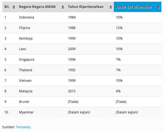 Hanya brunei, malaysia and myanmar yang masih belum melaksanakan vat/gst. Beliau menjelaskan semua hasil kutipan gst dimasukkan ke dalam kumpulan wang disatukan sebelum disalurkan kepada tabung amanah untuk membayar. Dengan yang demikian, eksport malaysia akan menjadi lebih berdaya saing di pasaran global memandangkan tiada gst dikenakan ke atas pengeksportan barang dan perkhidmatan. Apa yang berlaku sekarang ialah persepsi masyarakat yang beranggapan ekonomi negara bermasalah sedangkan keadaan sebenar tidaklah seperti itu. Mereka adalah arab saudi dan qatar.